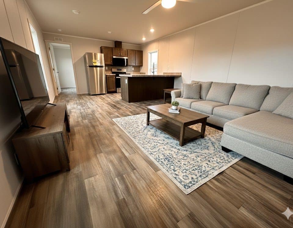 A sleek stainless steel ceiling fan anchors the living space, providing a modern aesthetic and perfect climate control, while dedicated washer and dryer hookups ensure your laundry routine is convenient and organized. Outside, the home's curb appeal is elevated by upgraded wood siding, giving the exterior a sturdy, timeless, and premium look.